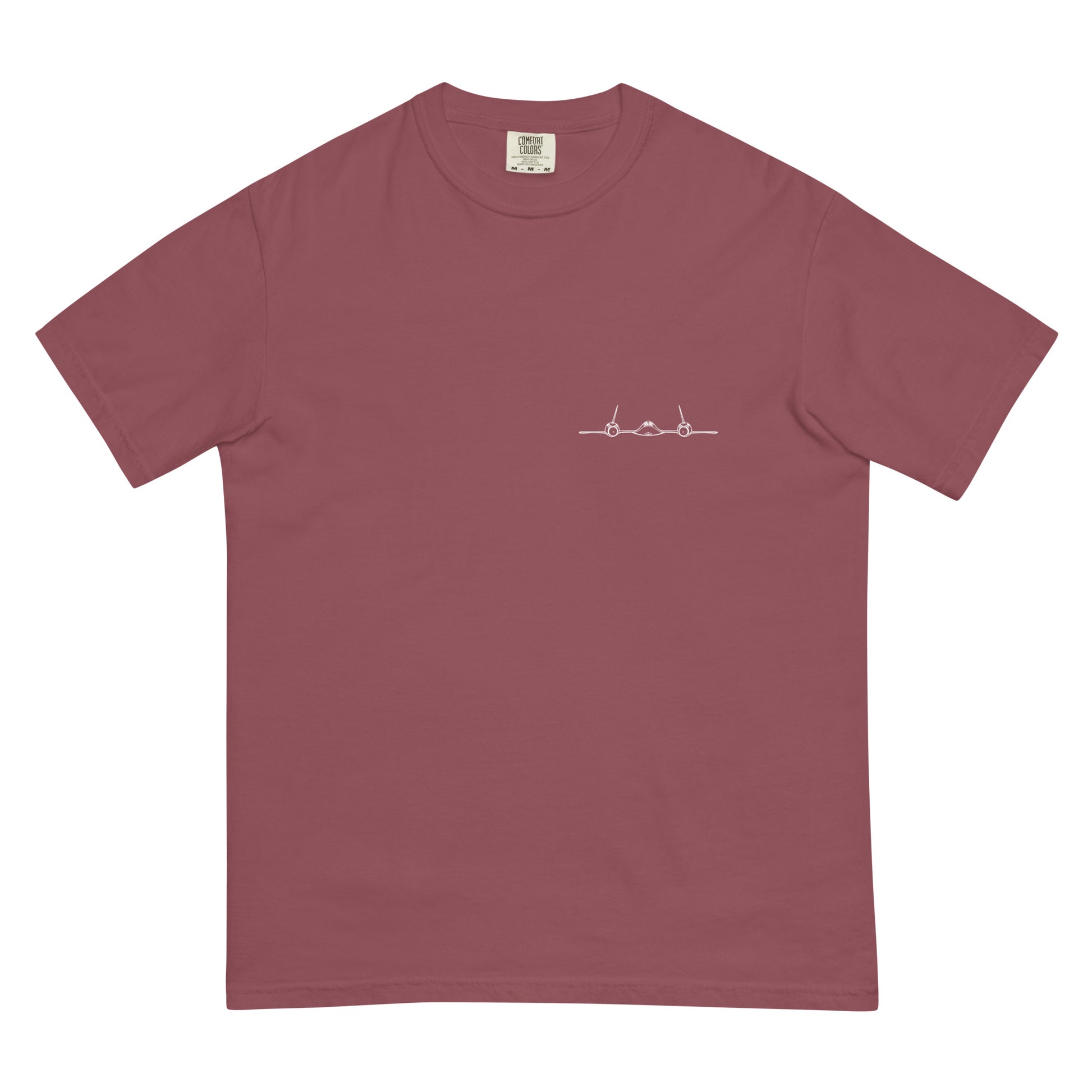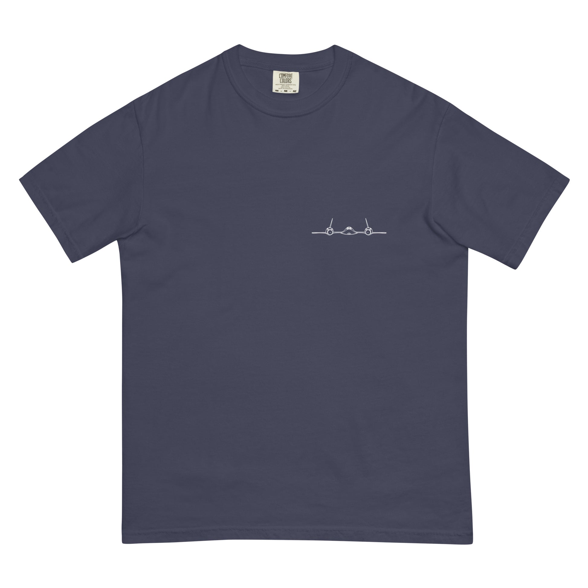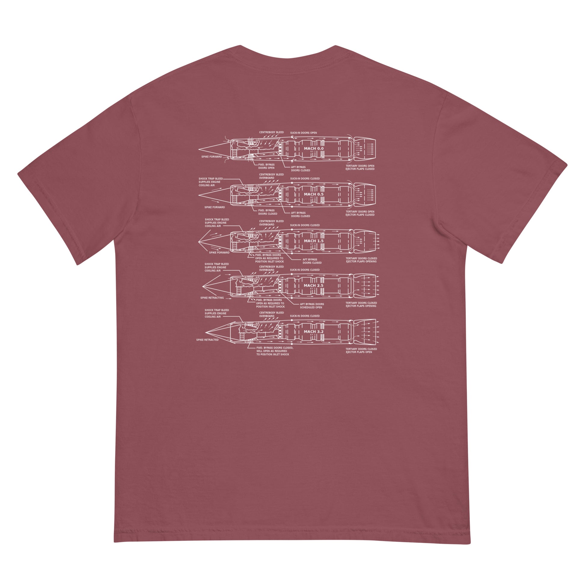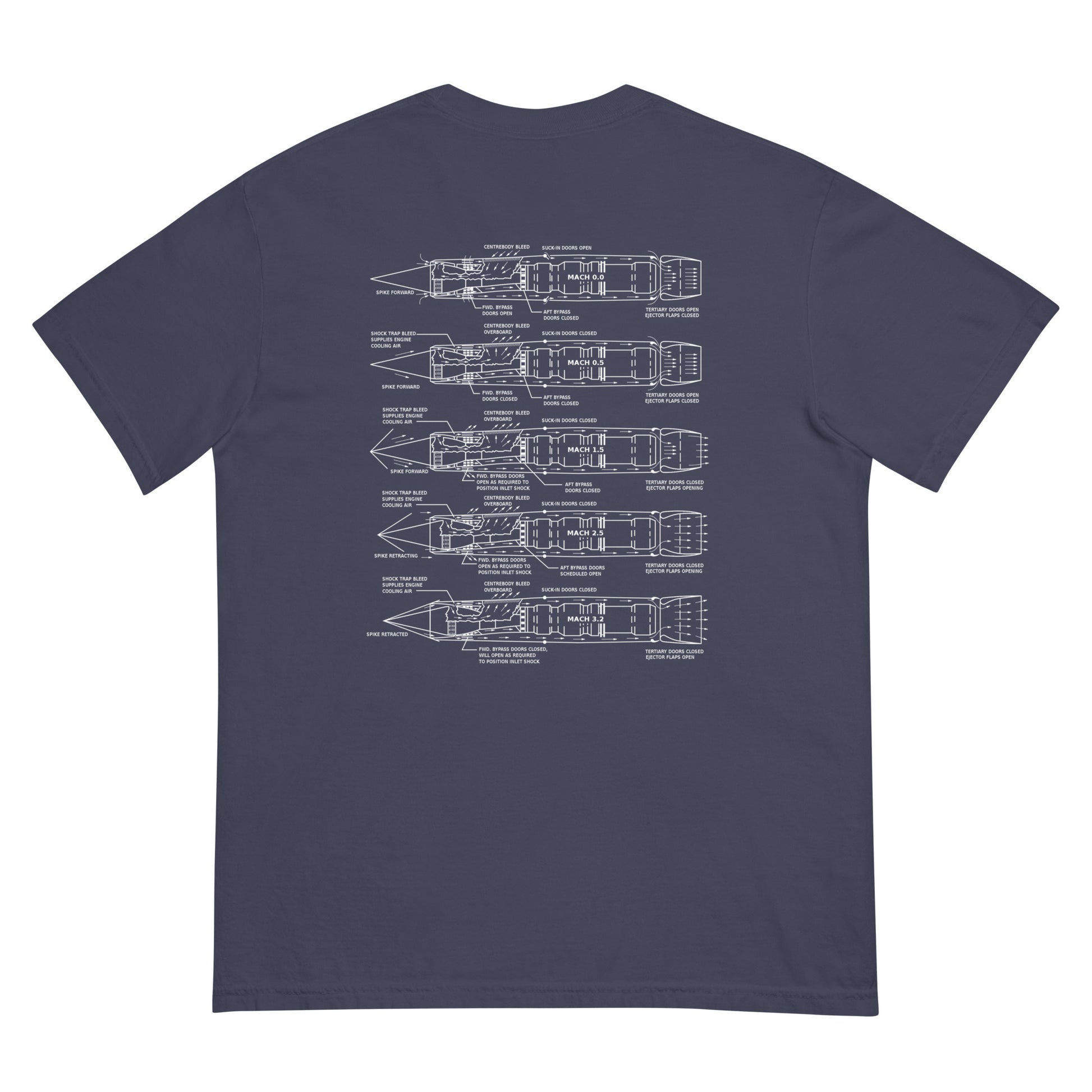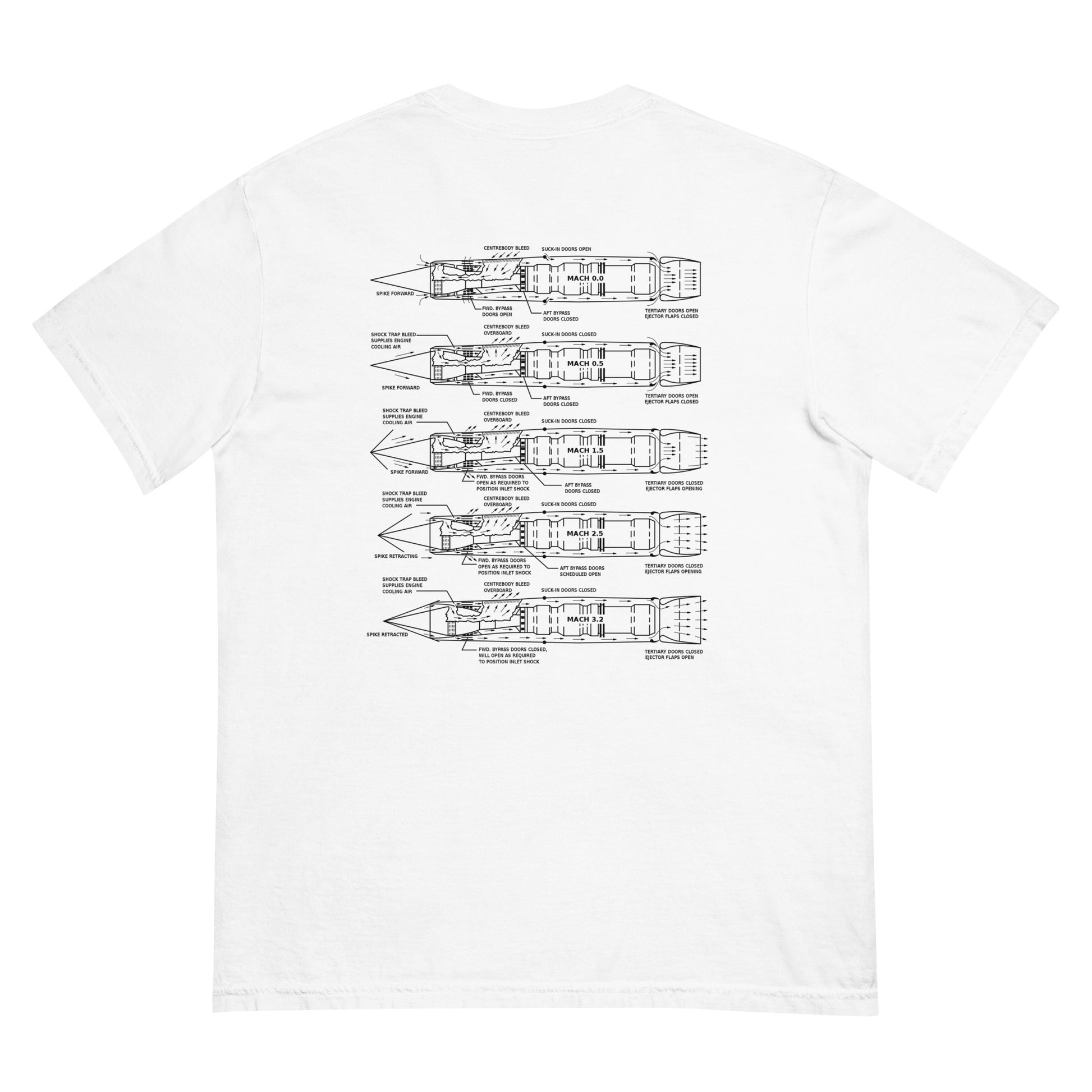 The SR-71 was powered to Mach 3.2+ by two J-58 engines. They used an inlet cone at the front of the engine to regulate the airflow for operating both the turbojet and afterburner. Most supersonic jet engines work with this concept in mind as well, but the SR-71 was unique in that once at high speeds it basically ran off full afterburner. It could evade SAMs with ease and was the fastest air-breathing thing in the sky. This shirt depicts a front view of the SR-71 on the front, and shows the engine diagram and air flow at different Mach numbers on the back.